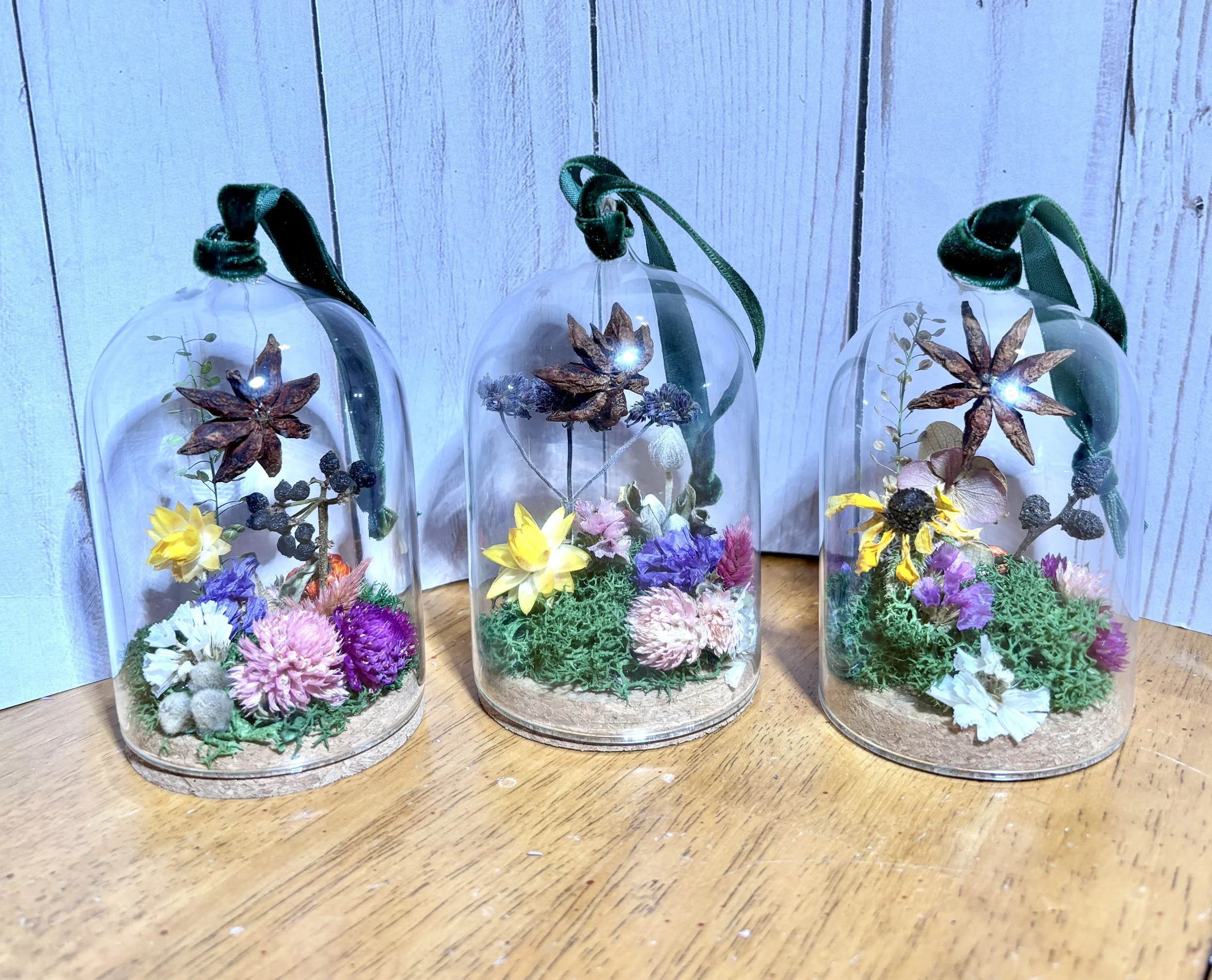 Colorful dried flowers in glass cloches